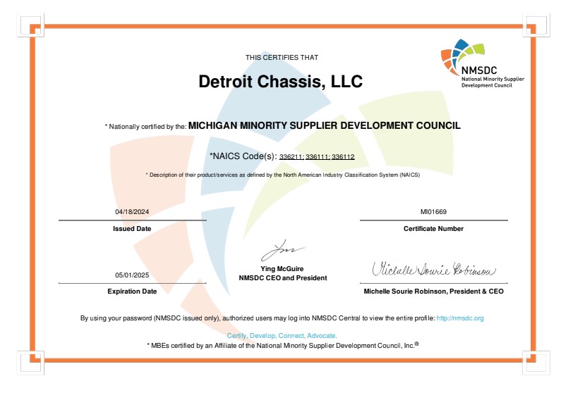Minority Certification Detroit Chassis is certified by the Michigan Minority Supplier Development Council, an affiliate of the National Minority Supplier Development Council, as a minority business enterprise.