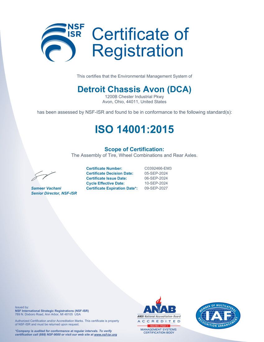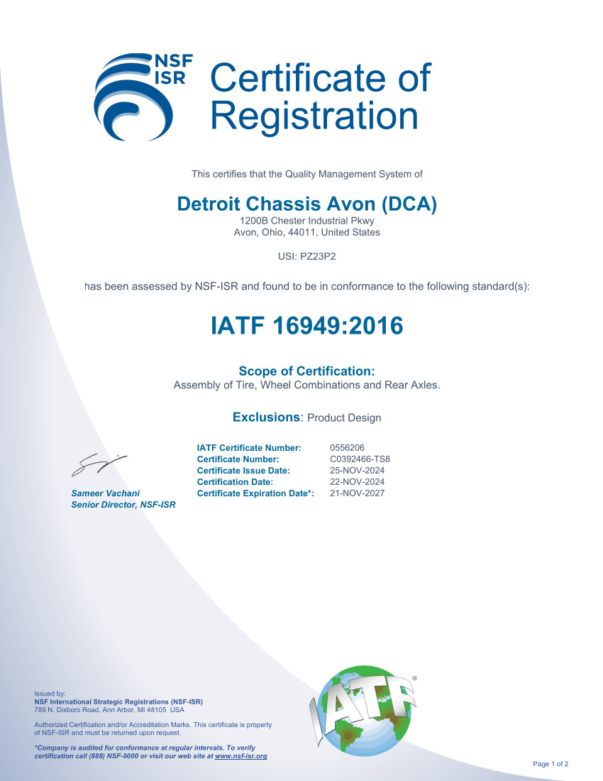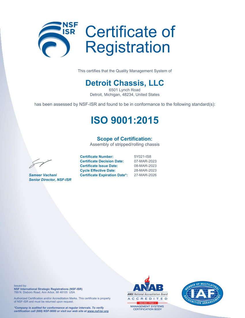 Quality and Environmental Certifications Detroit Chassis is certified by NSF International Strategic Registrations.